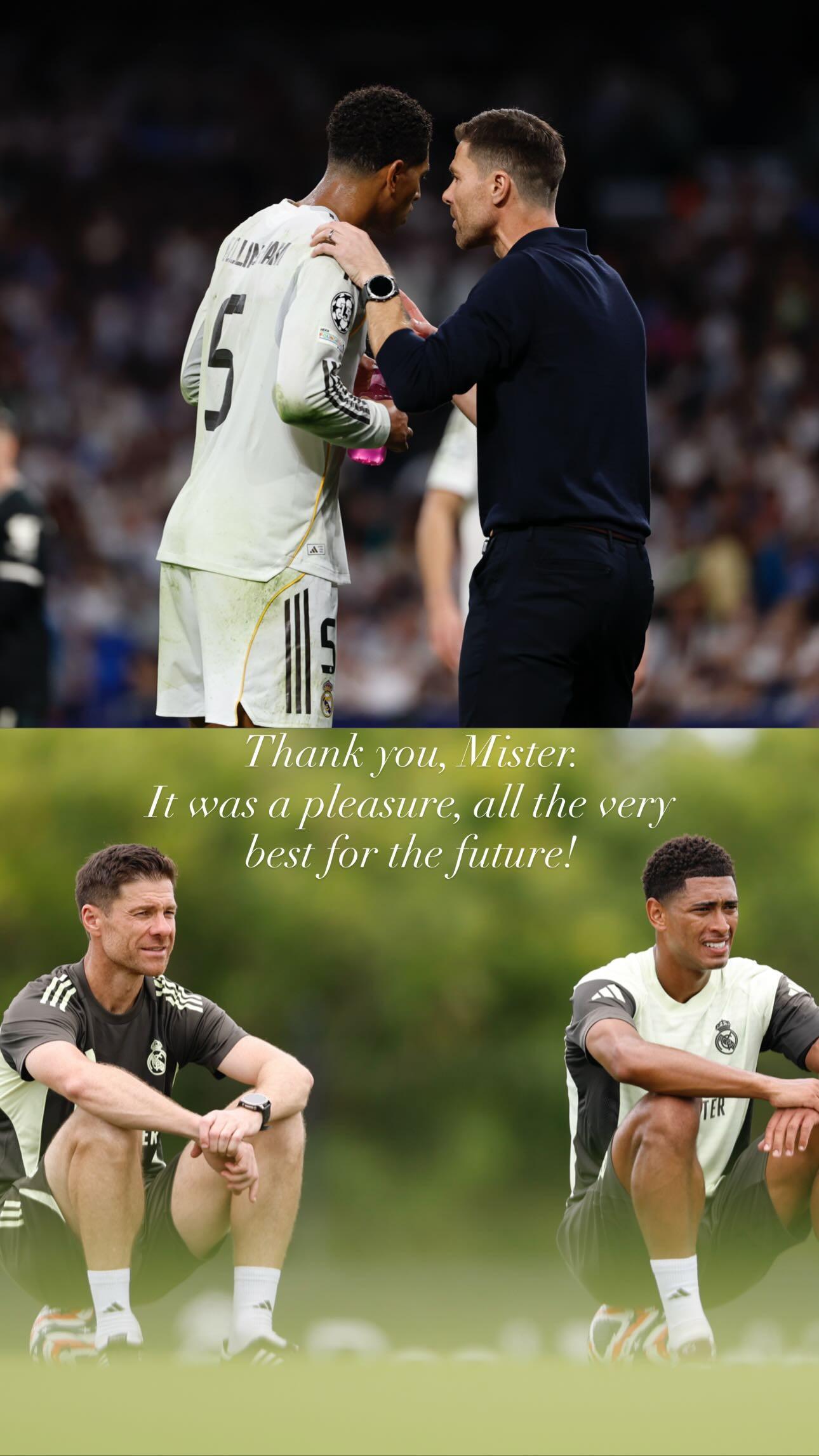 当地时间1月13日,贝林厄姆在社交媒体发布了他和哈维-阿隆索的同框照,并写道:“谢谢你,教练。很荣幸曾与你共事,祝你未来一切顺利!”